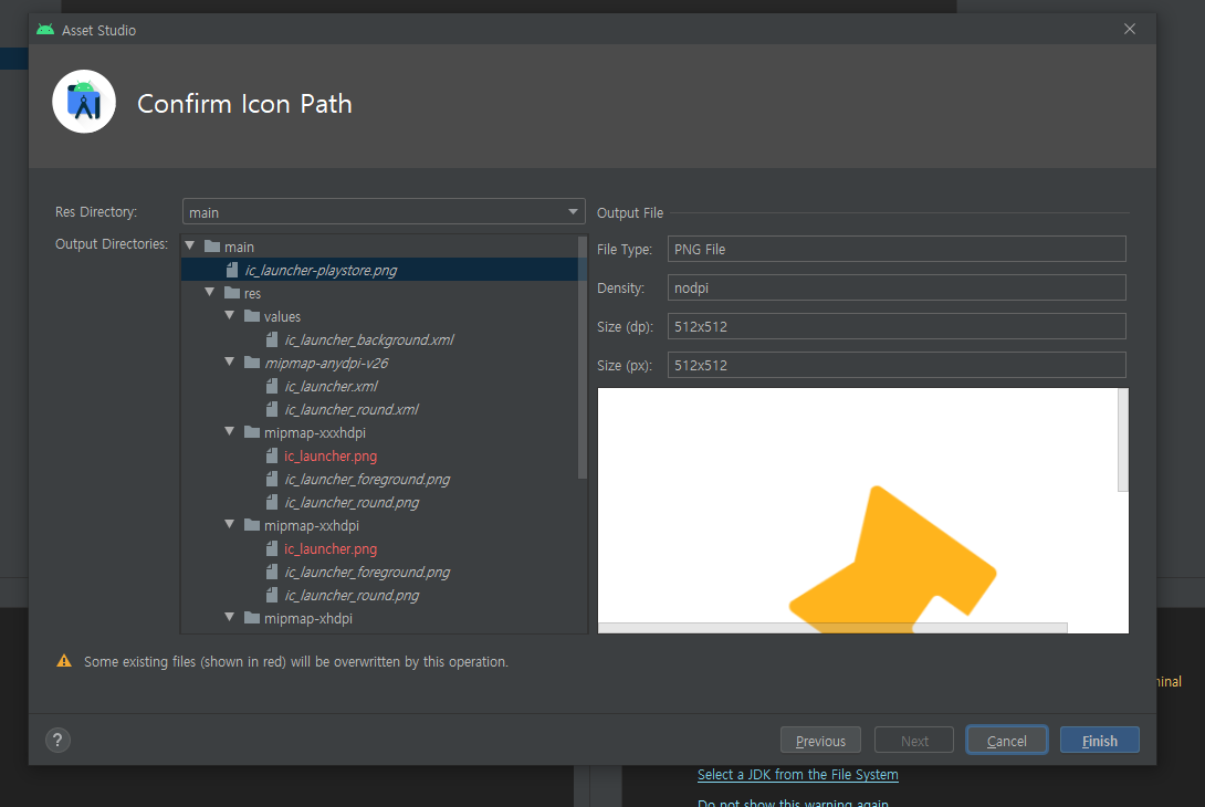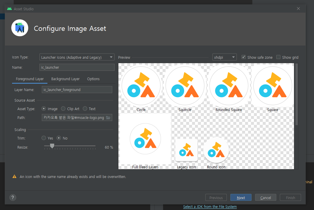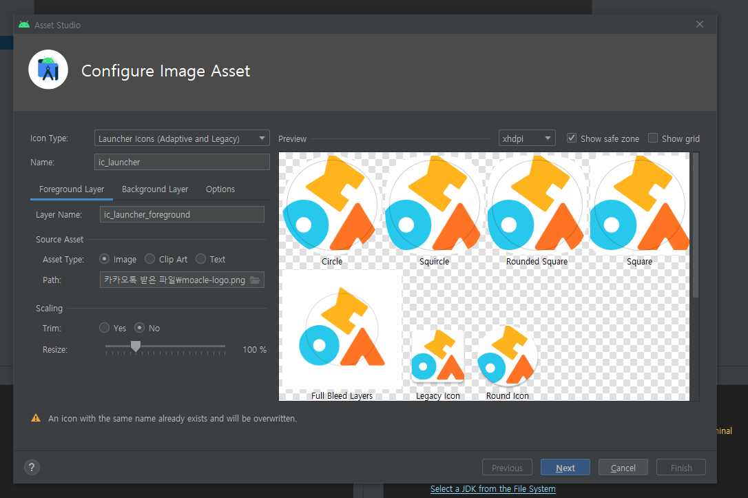 아이콘 이름은 default명인 ic_launcher 그대로 사용하겠습니다.